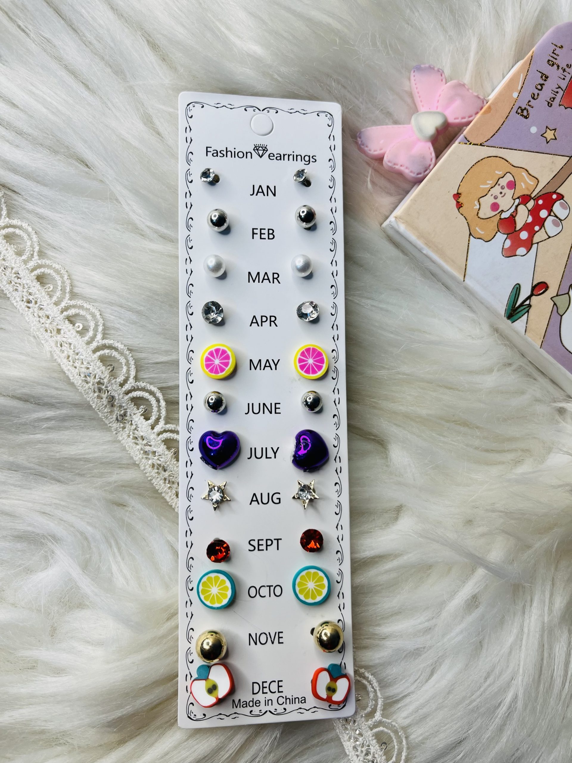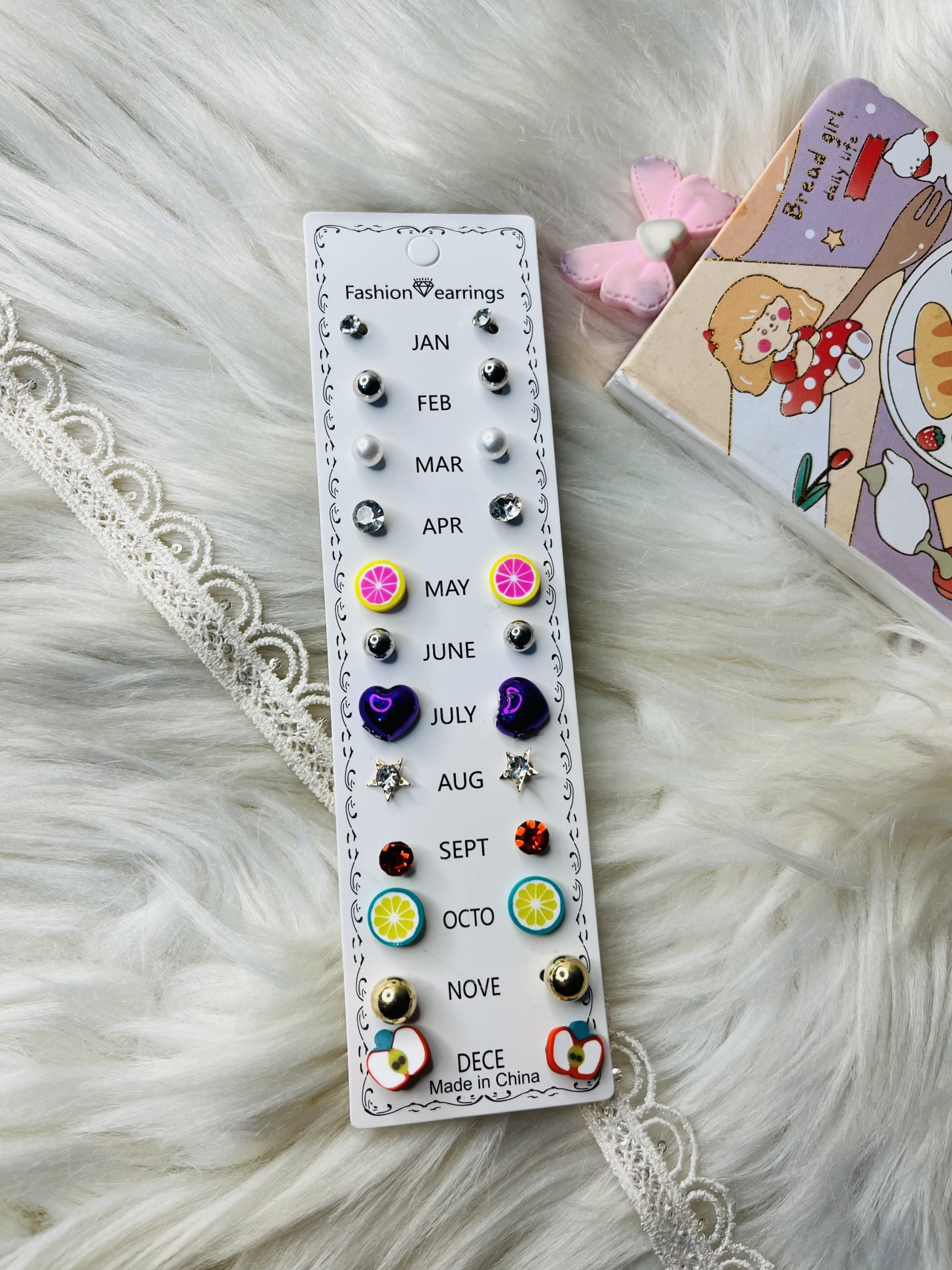 Pack of 12 Pairs -Stud Earrings Card Party Wear – With Stoppers – Multicolor