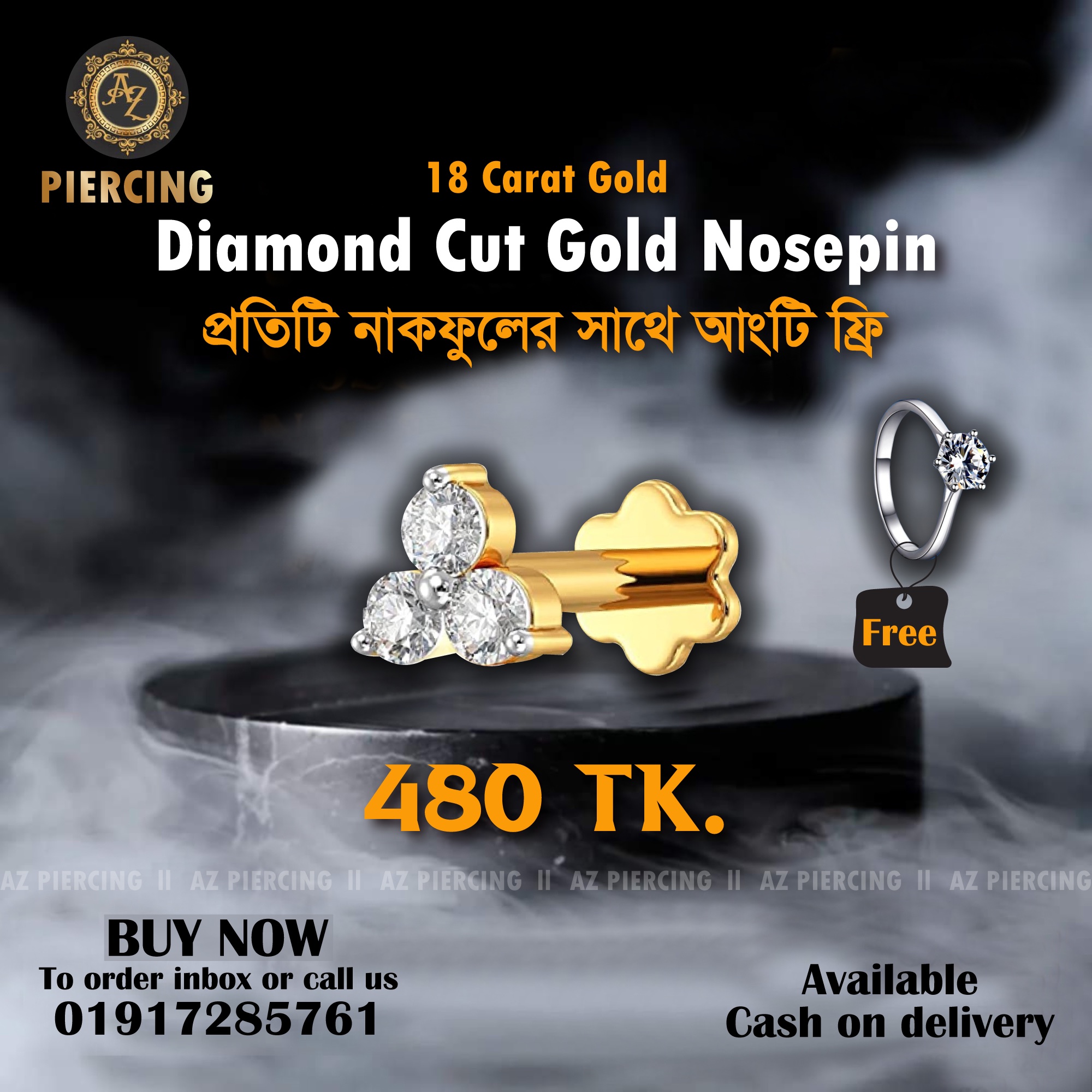 Diamond cut 18k gold 3 stone nosepin, diamond cut ring free